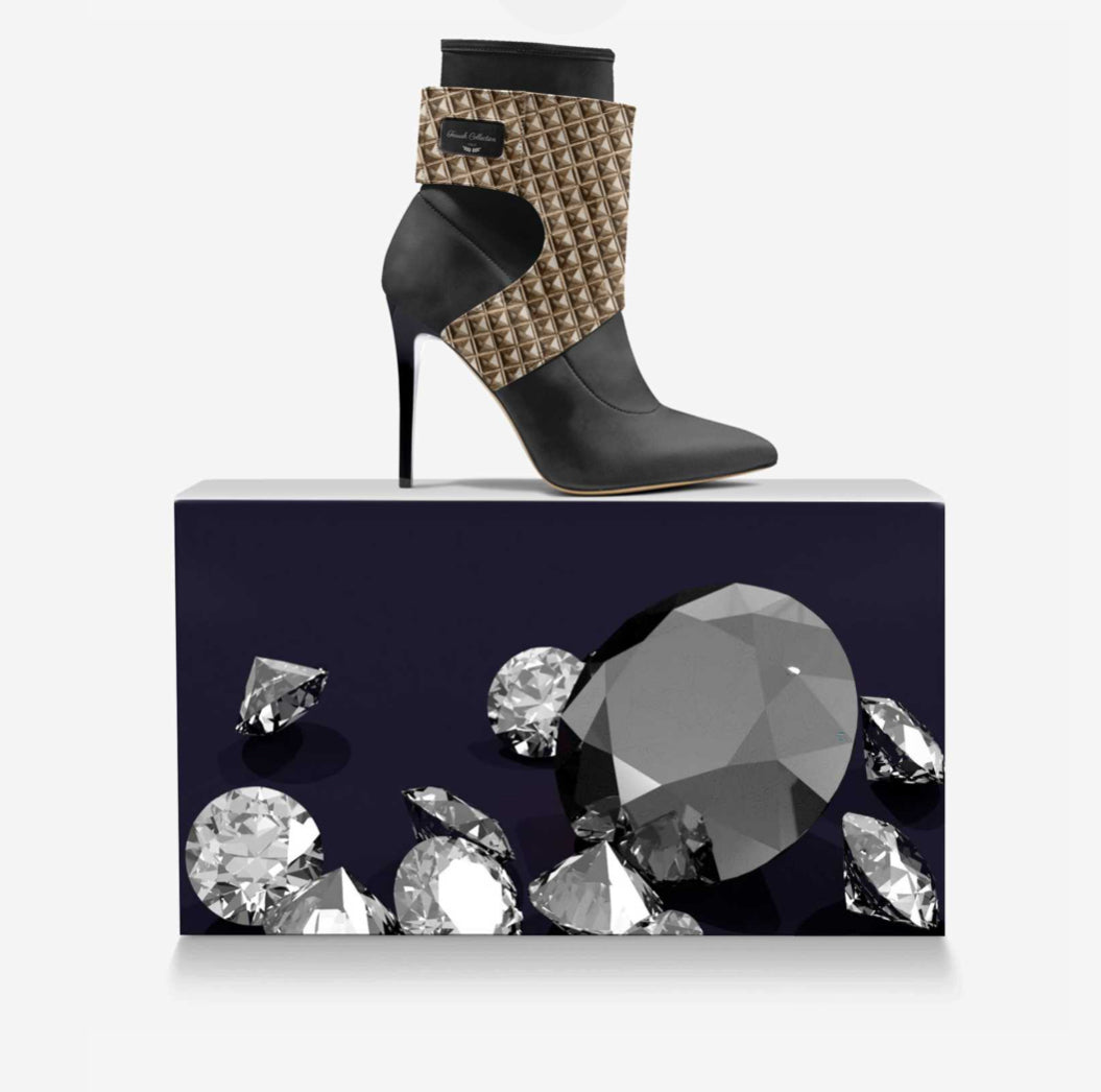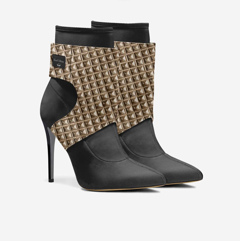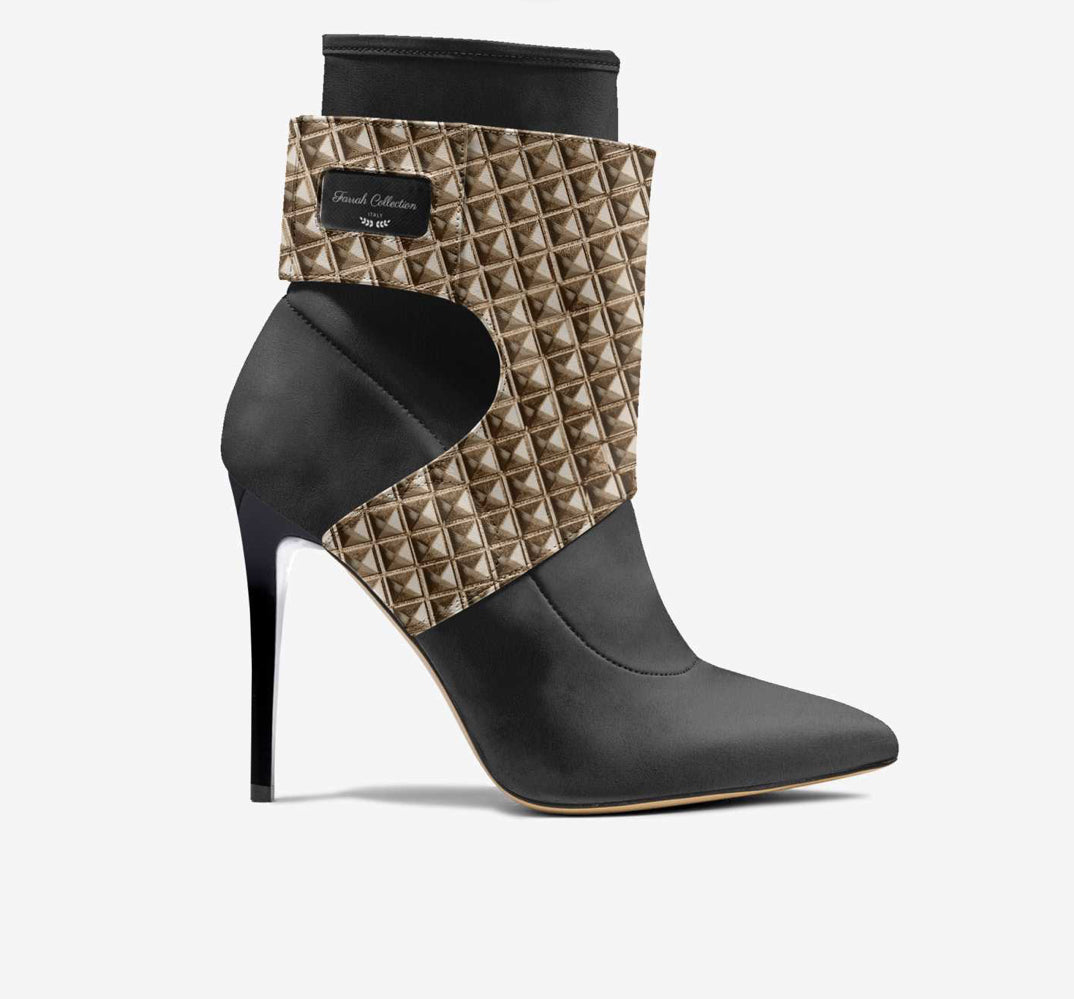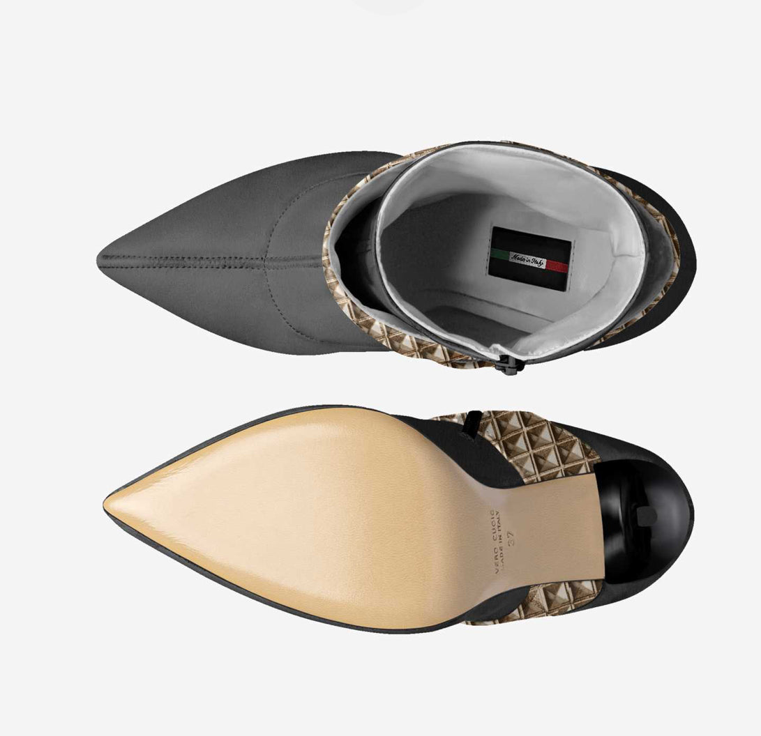 This boot’s futuristic design features artistically overlapping material layers. The 10.5-cm (4.1-in) razor-sharp stiletto heel is balanced with a unique panel overlay.
