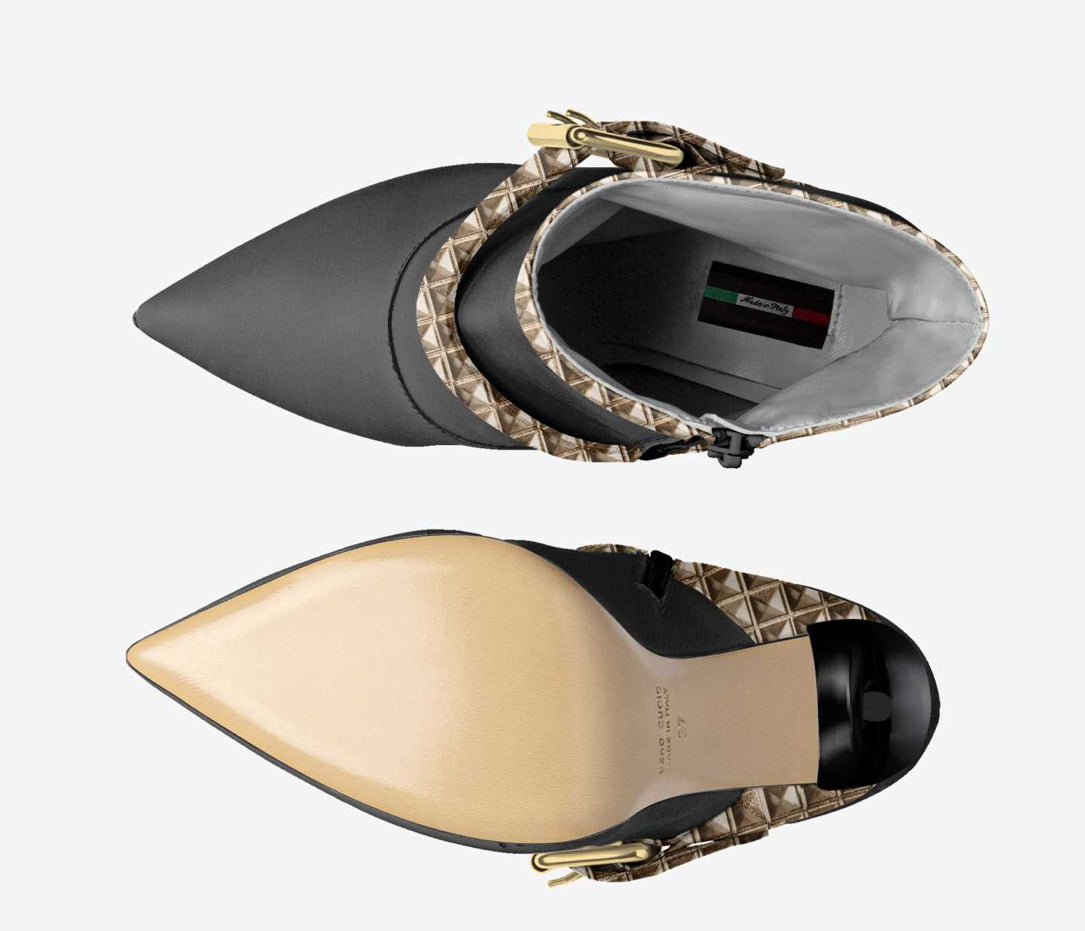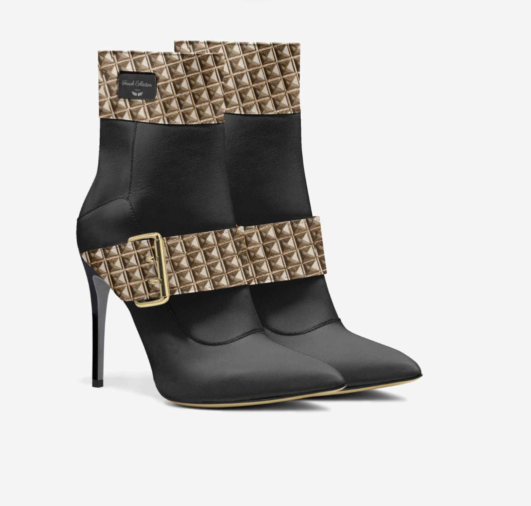 This high-heeled boot exudes seduction with a 10.5-cm stiletto heel and minimalist overlays. The adjustable oversize belt on the upper and a logo window add visibility