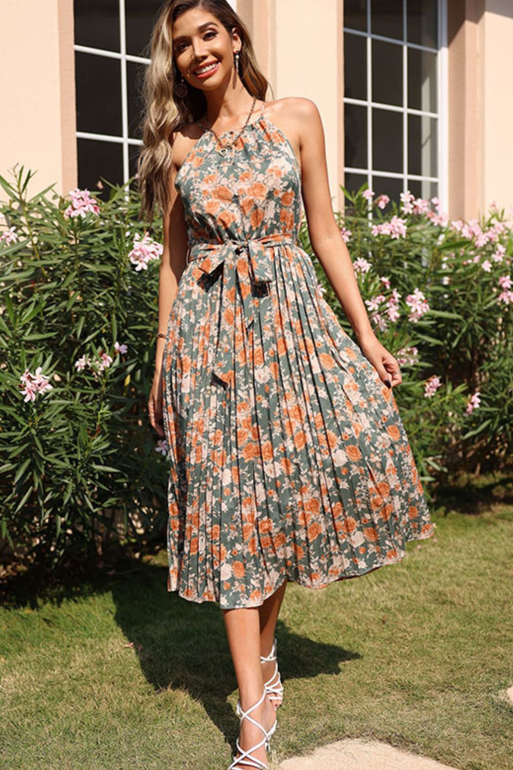 Floral Tie Waist Pleated Dress