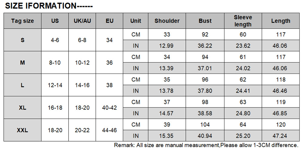 L: shoulder 13.7 in, bust 37.4 in, sleeve length 24.2 in, length 46 in